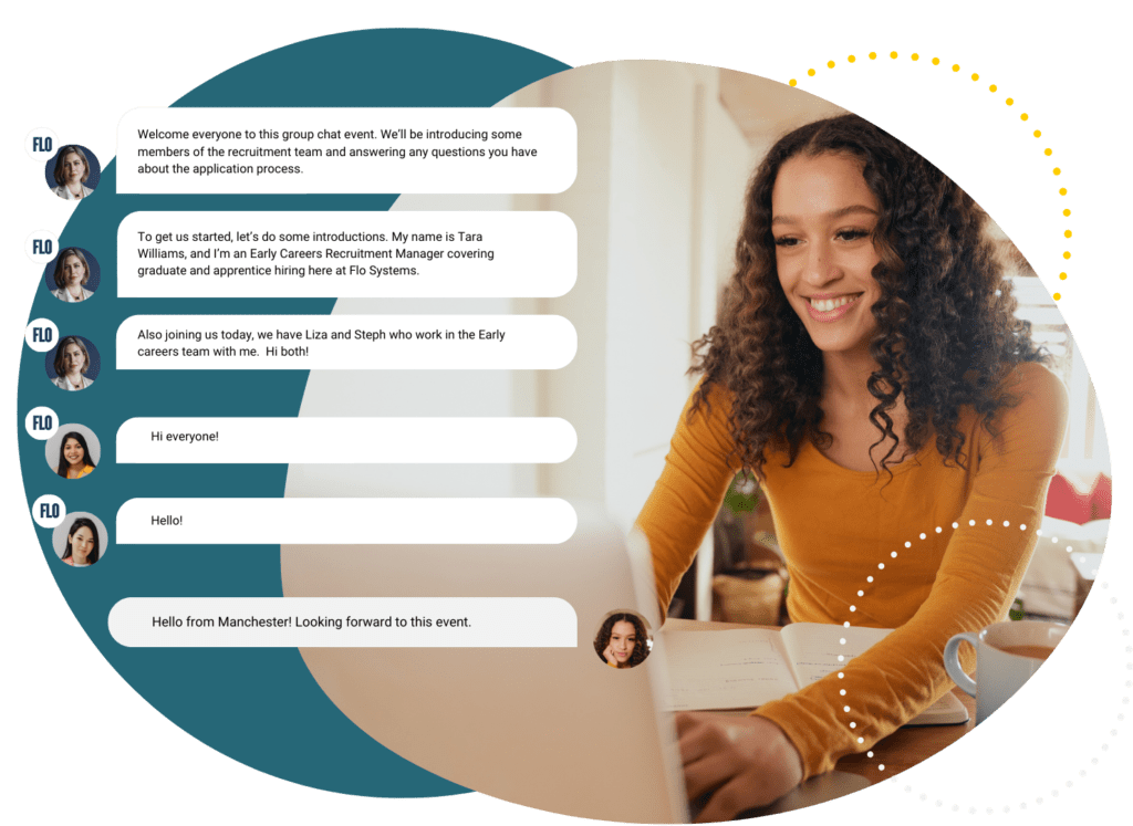 Our live chat technology enables organisations to host fully-branded group or 1 to 1 live chat events with candidates at any stage of the recruitment journey. These events can maintain engagement post-campus rounds, offer application guidance, and keep candidates warm post-offer. Live chat fosters interaction, provides support, and builds a sense of community.