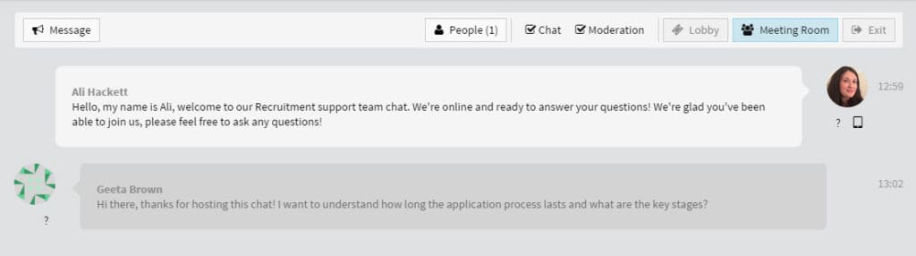 If you’re joined by other moderators, have them also send a welcome message or introduction if relevant – the more that’s in the room when participants arrive, the more they tend to feel comfortable joining in.